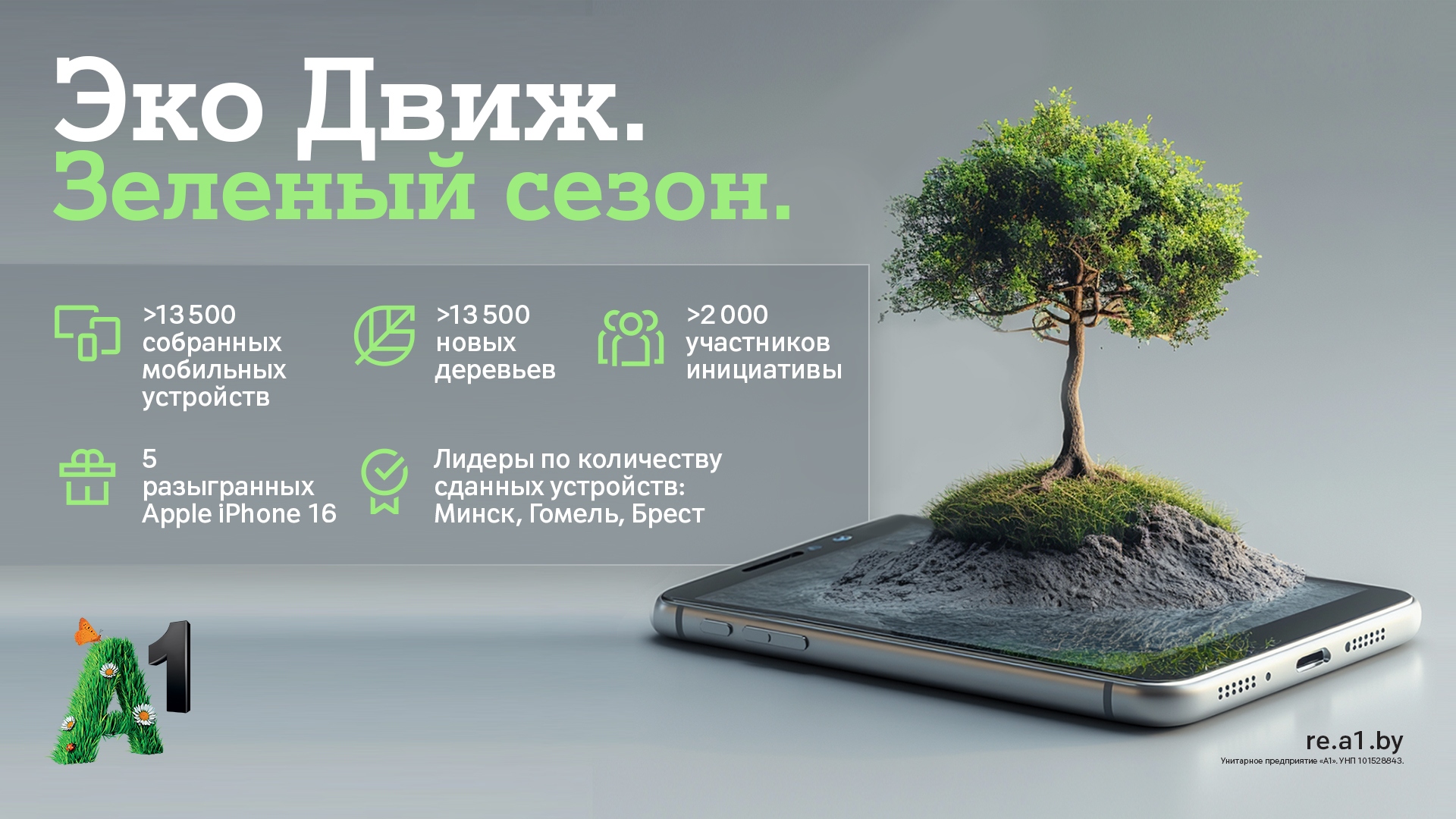 В рамках инициативы «Эко Движ. Зеленый сезон» белорусы с 10 марта по 13 апреля могли сдать свои старые мобильные телефоны, планшеты, смарт-часы, электронные книги и фитнес-браслеты в магазины А1. В обмен на каждое устройство они получали игровые коды для участия в розыгрыше призов – пяти смартфонов iPhone 16.