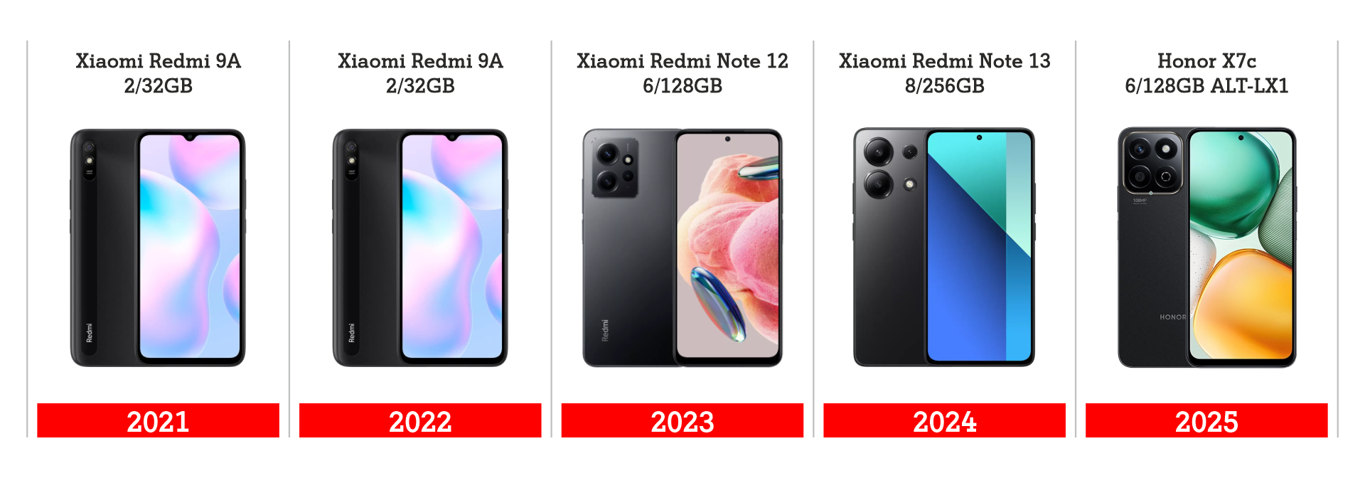 В 2023 году картина меняется на зеркальную: верхние строчки топ-10 занимают устройства с большим «запасом прочности» на будущее: Xiaomi Redmi Note 12, уже упомянутый Xiaomi Redmi Note 10 Pro, Honor X8a. А более бюджетные модели сместились в самый низ рейтинга.